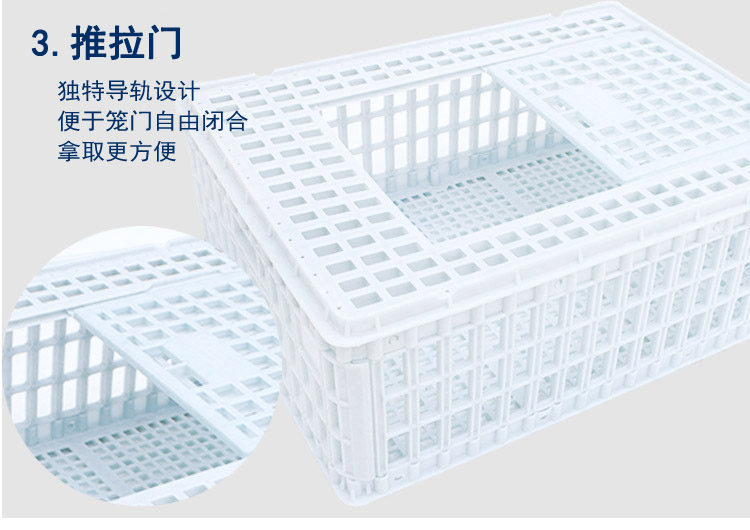 a.长方形体结构有利于装车、卸货,提高工作效率;箱底为特殊设计,承载性能好,能有效避免活鸡、兔擦伤、瘀血。